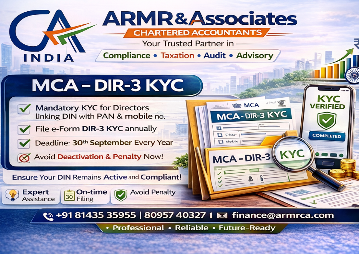 Every individual who holds a Director Identification Number (DIN) under the Companies Act must periodically confirm their personal details with the Ministry of Corporate Affairs (MCA). This is done through DIR‑3 KYC on the MCA‑21 portal.